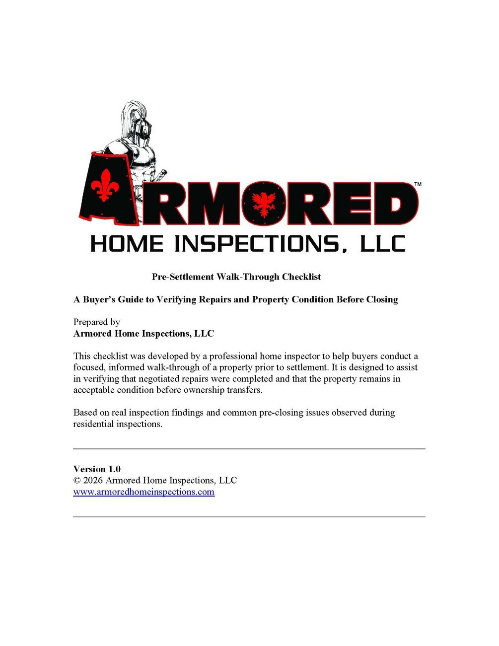 This Pre-Settlement Walk-Through Checklist was created by a professional home inspector to help buyers conduct a focused, organized final walk-through prior to settlement.